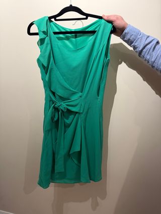 Vestido de fiesta elegante en color verde. - Diseño cruzado con lazada. - Detalle de volantes. - Cremallera lateral.