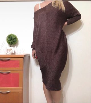 Vestido Zara Knit, color burdeos, escote asimetrico y manga larga. Tejido de punto bastante elastico. Talla M. Composicion 77% Viscosa 23% Poliester. Dos usos. Medidas Sisa a Sisa 70 cm Cintura 60 cm Largo 92 cm