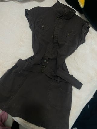 Vestido vaquero corto con tirantes cruzados en la espalda de la marca Easy Wear talla S. Un básico para cualquier armario. - Nuevo, muy poco usado. - Diseño con tirantes cruzados en la espalda. - Bolsillos en la parte delantera . - Costuras en contraste. - Cómodo de llevar.