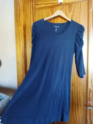 Vestido de punto fino, tejido tipo camiseta, azul marino, con mangas abullonadas. Ancho de sisa a sisa 50 cm Ancho de cintura 43 cm Ancho de cadera 52 cm Largo 84 cm Compra solidaria por los animales sin hogar. Gracias por colaborar.