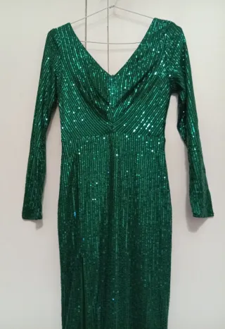 Elegante vestido largo con lentejuelas brillantes. Un diseño sofisticado para ocasiones especiales. - Manga larga. - Escote en V cruzado. - Corte ceñido al cuerpo. - Nuevo
