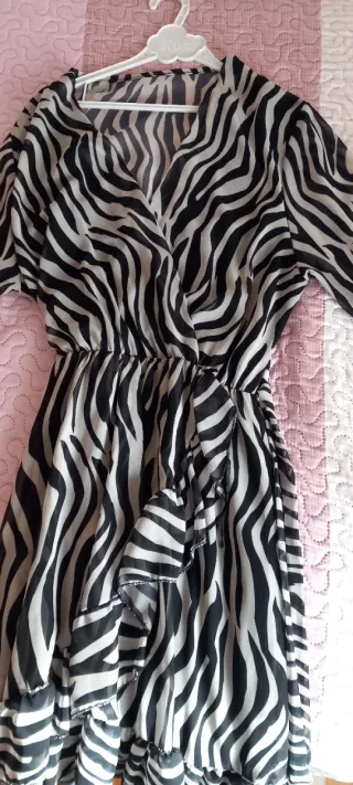 Vestido con un llamativo estampado de cebra. Su diseño fluido lo hace ideal para diversas ocasiones. - Estampado de cebra en blanco y negro. - Diseño cruzado con cinturón. - Falda con volantes.