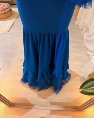Vestido de flameca largo en color azul, con un diseño llamativo. - Mangas largas acampanadas con volantes de tul. - Falda con volantes en cascada y detalle de tul. - Escote pronunciado en V.
