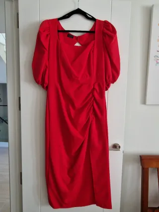 Elegante vestido midi en color rojo, ideal para eventos y ocasiones especiales. - Diseño con escote cuadrado. - Mangas abullonadas. - Detalle fruncido en la cadera. - Abertura en la espalda con botones y lazo Boda, bautizo, comunion, evento especial