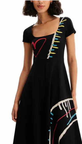 Vestido de corte A con un diseño llamativo. - Escote cuadrado. - Manga corta. - Estampado de corazón rojo y detalles gráficos en blanco, amarillo y azul.