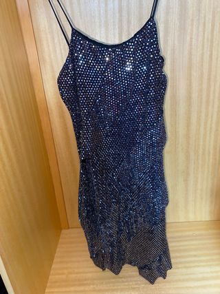 Vestido de noche con un diseño brillante y elegante. Ideal para eventos especiales. - Tejido con lentejuelas plateadas y negras. - Tirantes finos. - Corte asimétrico. - Volantitos por delante