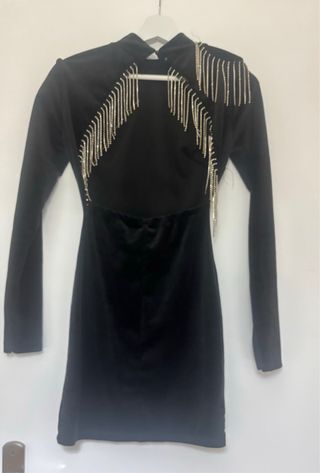 Elegante vestido de terciopelo con detalles de pedrería. - Diseño de manga larga. - Adorno de pedrería en los hombros y lateral.