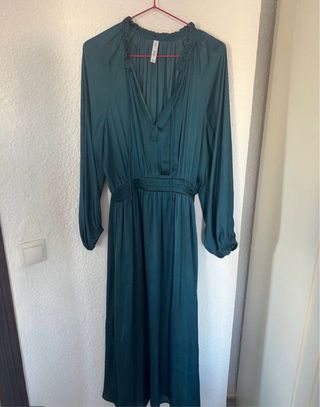Vestido largo de Mango nuevo a estrenar con escote en pico y manga larga. - Tejido satinado. - Cintura elástica. - Detalle de fruncido en el cuello. - Cierre con cordones. Mas vestidos de este estilo en mi perfil Se realizan lotes ropa con descuento