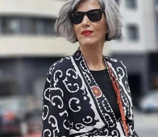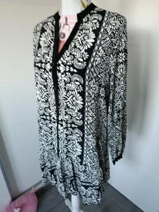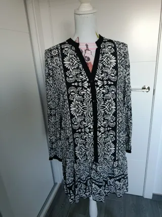 Vestido de mujer con un llamativo estampado. - Diseño de manga larga. - Cuello redondo con detalle de botones. - Estampado floral en blanco y negro.