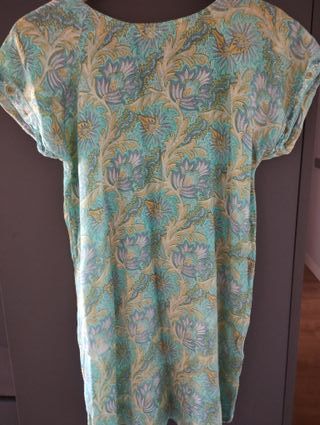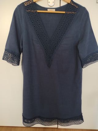 Vestido playa de Ysabel Mora. Manga al codo, bordados en cuello, mangas y bajo. 85% viscosa y 15% lino. Muy poco uso