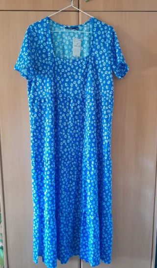 Vestido largo con estampado floral sobre fondo azul. - Las dos primeras fotos no refleja bien el color,es más bonito puesto. - Cuello cuadrado. - Diseño con volantes. -Largo