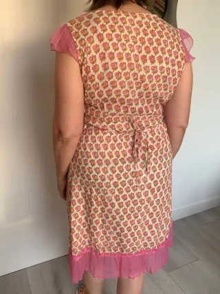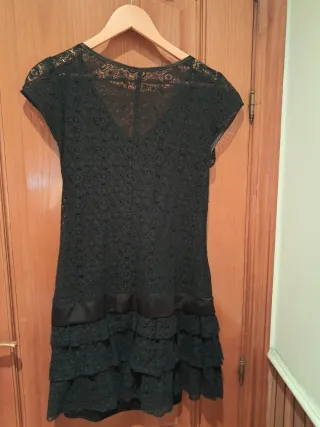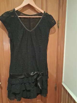 Vestido con bajo abullonado. Tiene un gran lazo que se puede anudar delante o detrás. Usado una vez. Es una 42, pero talla como una 40.