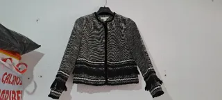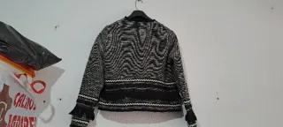 Elegante chaqueta tejida con un diseño moderno. - Patrón de tejido texturizado en blanco y negro. - Ribete negro a lo largo del frente abierto. - Adorno de flecos en los puños y en el bajo.