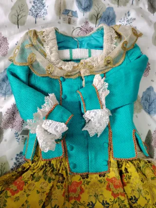 Conjunto de vestido de fallera para niña, con un diseño tradicional y elegante. Desde 2 a 4 años. - Cuerpo en color turquesa con detalles dorados. Más grandecito. -Cuerpo misma tela que la falda, para más pequeña. - Falda con camisa cosida para las comodidad de la peque y poder alargar y acortar. - Incluye manteletas pero no delantal. Tengo los zapatos a juego con el corpiño turquesa talla 27