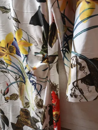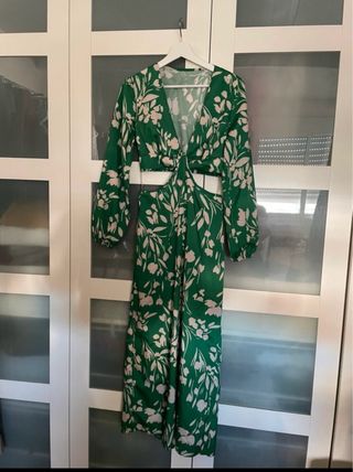 Vestido de Zara con un vibrante estampado floral. - Diseño de manga corta. - Cuello camisero. - Largo hasta la rodilla.