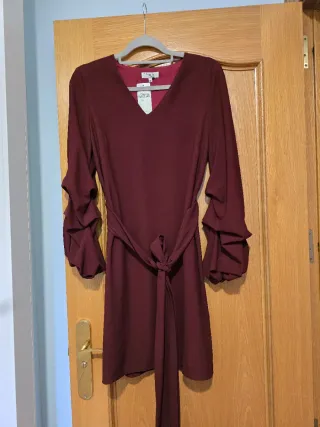 Vestido de manga larga con cinturón. Formal, elegante y sencillo. Talla 36 pero da talla. Queda suelto, o puedes regular esa parte de la cintura como te guste más con el cinturon de tela que lleva. - Diseño con cuello en V. - Mangas abullonadas con detalle. - Cinturón para ajustar a la cintura.