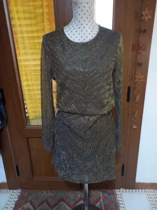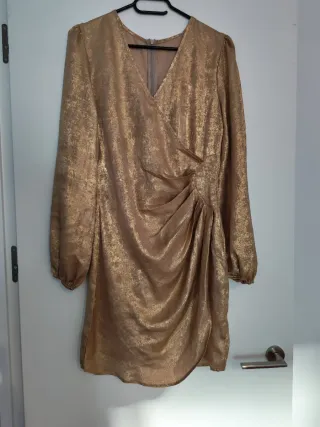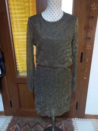 Vestido de fiesta con un acabado brillante y elegante. - Diseño con manga larga. - Tejido con textura acanalada. - Cintura marcada para un ajuste favorecedor. - color dorado Mangas y edpalda semi trandparentes resto tiene forro - edpalda ligeramente abierta Elástico en cintura Talla L( sirve de L muyentallada y como M amplia - puesto 1 vez, como nuevo * dispongo de + artículos similares en mi perfil * envío rápido y cuidado, limpio y listo para usar