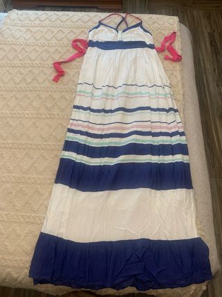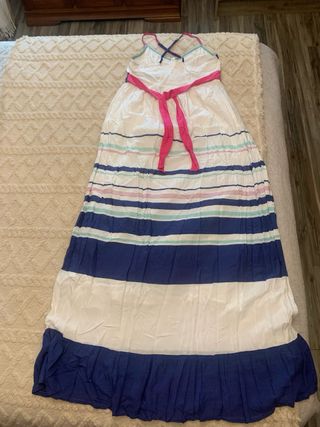 Vestido largo de verano con un diseño a rayas. - Tirantes finos. - Lazos rosas en los laterales. - Estampado de rayas horizontales en varios colores.