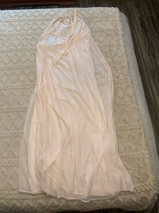 Elegante vestido largo de Zara en tono rosa. Presenta un diseño con escote halter y detalles de encaje en la parte superior. - Escote halter. - Detalle de encaje en el pecho. - Tejido ligero y vaporoso.