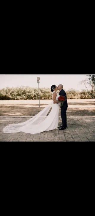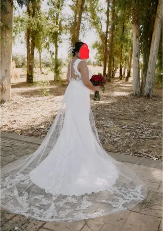 Elegante vestido de novia de corte sirena, con detalles de encaje en la espalda y velo a juego. - Espalda con abotonadura y detalles de encaje. - Velero largo con apliques de encaje. - Diseño de corte sirena.