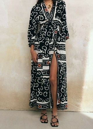 Elegante vestido estilo kimono con un llamativo estampado. Cinturón incorporado. Largo hasta los pies. - Diseño cruzado con cinturón. - Manga larga. - Corte maxi con abertura. - Estampado abstracto en blanco y negro.