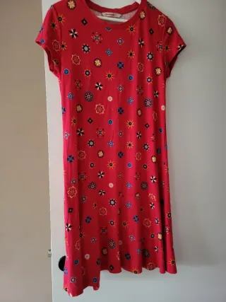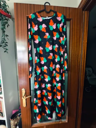 Vestido midi negro con estampado de calaveras multicolor (rojo, rosa y verde) muy alegre. Elástico, ajustado en pecho con corte evasé. 93% poliéster, 7% elastano Medida de sisa a sisa: 43 cms Marca Aire retro, talla S. Añado foto de la propia marca para que se aprecie el tono del rosa que en mi foto no se logra. Puesto en una sola ocasión. Vendo por cambio de talla. Está impecable, muy bien cuidado. Agotado en la marca