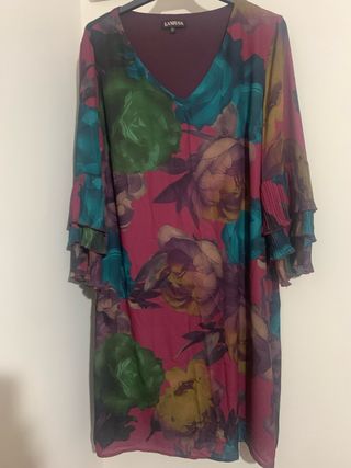 Vestido con un vibrante estampado floral. - Diseño de cuello en V. - Mangas largas con volantes. - Tejido ligero y fluido.