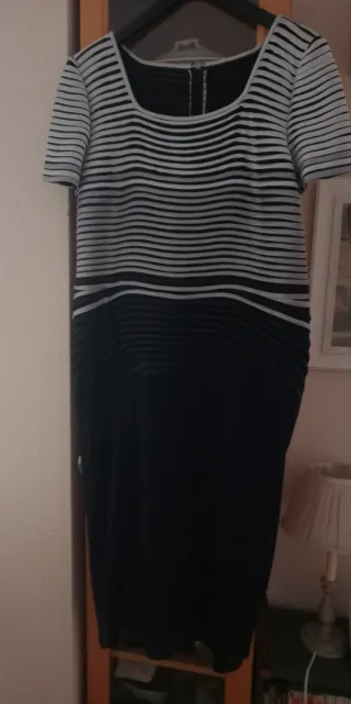 Elegante vestido largo para tus mejores ocasiones. La parte superior presenta un patrón de rayas finas en blanco y negro solapadas, mientras que la parte inferior es de un negro sólido y liso. Puesto sólo en una ocasión; está nuevo