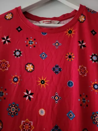 Vestido de manga corta con un vibrante estampado. - Diseño con motivos geométricos y florales. - Cuello redondo. - Corte recto.