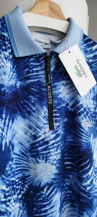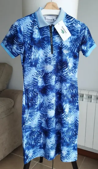 Vestido de la marca Lacoste con un llamativo estampado. - Diseño con cuello tipo polo y cremallera. - Mangas cortas. - Estampado abstracto en tonos azules y blancos. Talla XL NUEVO CON ETIQUETA