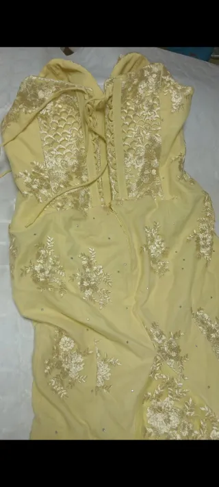 Vestido de fiesta con un diseño elegante y detalles bordados. - Escote corazón. - Corsé con cordones. - Bordados florales dorados. - Pequeños detalles brillantes.