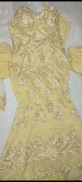 Vestido de ceremonia, muy bonito, está por estrenar,se me pasó la fecha de devolución y no he podido devolverlo me costó 28 euros es la talla M..medidas para Pecho: 94 cm, Contorno cintura: 75.5 cm, Largo: 153 cm, Largo de la manga: 62 cm