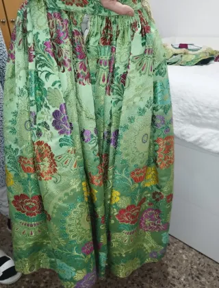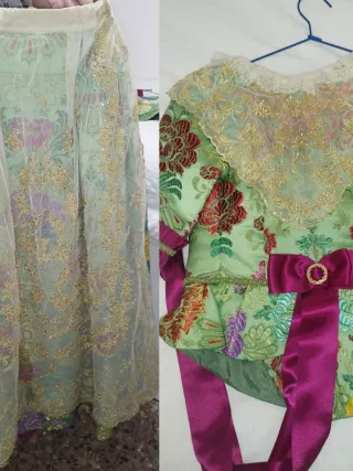 Precioso vestido de fallera con un diseño floral muy detallado. - Tejido principal en tono verde menta. - Bordados florales en hilo dorado. - Detalle de encaje en el cuello. - Lazos de raso en color fucsia.