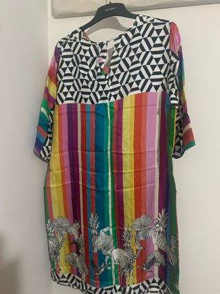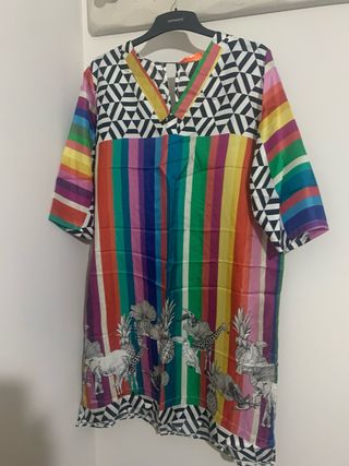 Vestido con un diseño vibrante y llamativo. - Estampado de rayas verticales en múltiples colores. - Diseño con figuras de animales y piñas en la parte inferior. - Cuello en V con detalle geométrico en blanco y negro.