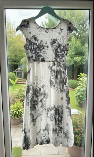 Precioso y estiloso vestido de seda 100% de la marca La Perla., con un estampado floral en blanco y negro. Está forrado, como nuevo. Es una 38 pero talla justo, más bien 36. Lo vendo porque me queda un poco pequeño de torso. Ideal adolescentes o chicas con tallas 34-36.