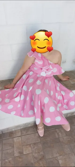 Traje de flamenca es muy buen estado, lo usó una adolescente que medía 1,7 metros. Tiene tres bonitos volantes y un bolsillo debajo del primer volante. Las mangas son de farol Es las fotos se ven las medidas, aún se le puede sacar en los laterales 4cm en casa lado y 1cm por los costados (dos delanteras y dos traseras). - Estampado de lunares blancos sobre fondo rosa.