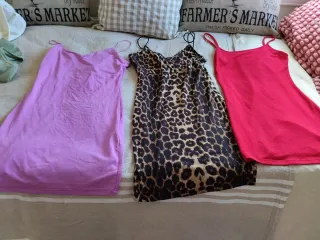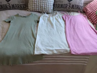 Lote de vestidos de tejido acanalado, ideales para adolescentes. - Vestido de manga corta en color verde. - Vestido de tirantes en color blanco. - Vestido de tirantes en color rosa. Y otros más. También hay monos . Cada lote de 3 prendas 16 euros. Cada unidad 7 euros.