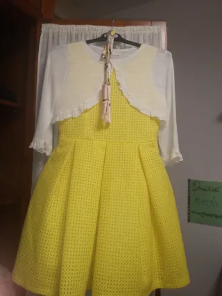 Vestido para adolescente, ideal para fiestas. Combina tonos amarillos y blancos. - Diseño con textura. - Incluye chaqueta bolero a juego.