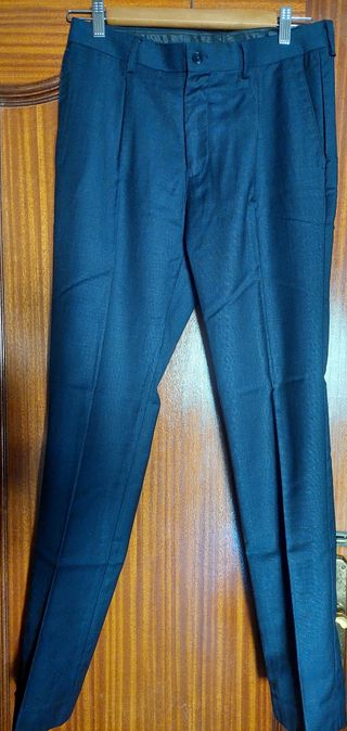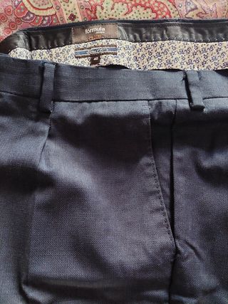 Pantalon de vestir adolescente. Talla 40 Fórmula Joven (El Corte Inglés).Más ropa en mi perfil. Medidas: contorno cintura 83 cm, largo de pierna 1,02cm + 3cm de dobladillo, largo entrepierna 78, tiro trasero 46 cm Cierre de cremallera y botón. Trabillas en cintura, refuerzo interior en cintura. Bolsillo trasero con botón. El color es una mezcla entre azul marino y azul navy; muy elegante y ponible con todo. En perfecto estado. Prácticamente nuevo. Se le quedó pequeño a mi hijo.