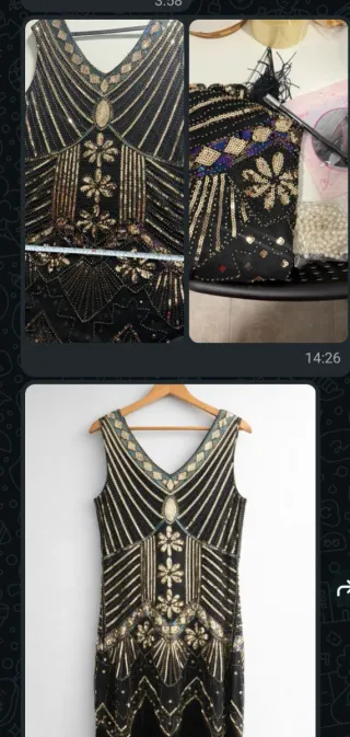 Vestido estilo años 20 con detalles de pedrería y lentejuelas. - Diseño con escote en V. - Adornos florales y geométricos. - Ideal para fiestas temáticas.