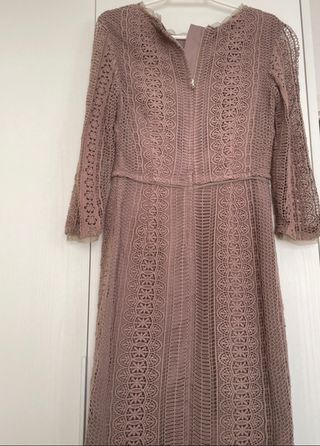 Vestido marrón claro muy bonito y elegante de Massimo Dutti. Completamente de encaje: encaje transparente en las mangas y forrado en el resto del vestido. Tul en mangas y cuello, cremallera dorada en la espalda y mangas 3/4. Marcado en la cintura, corte muy bonito, un poco vintage, años 60. Perfecto para fiestas, cócteles, eventos de trabajo, bodas. Excelente estado.