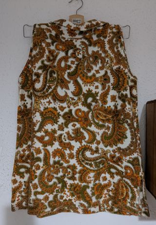 Vestido corto/top sin mangas, playero, de tejido tipo toalla. Cuello tipo camisa. Estampado paisley en naranja, marrón, verde caqui, etc. sobre fondo blanco. Tiene dos aberturas en la parte inferior, a los lados. Auténtico de los años 60, hecho por una modista. Equivaldría a una talla M. En perfecto estado.