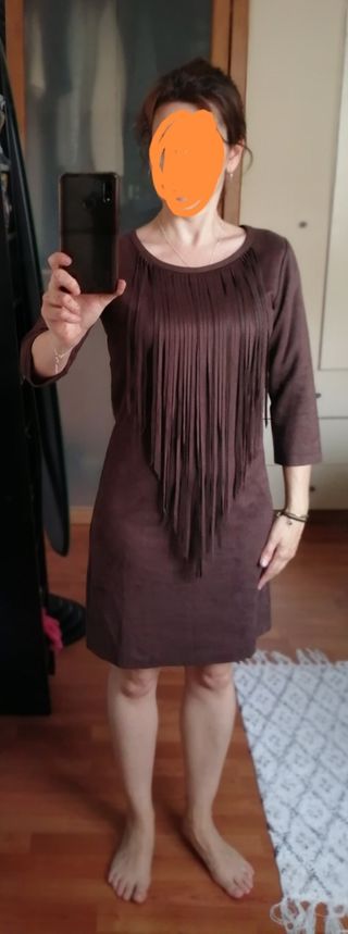 Vestido marrón de antelina. Con flecos en la parte del busto y manga tres cuartos. Puesto en una ocasión. Talla XS
