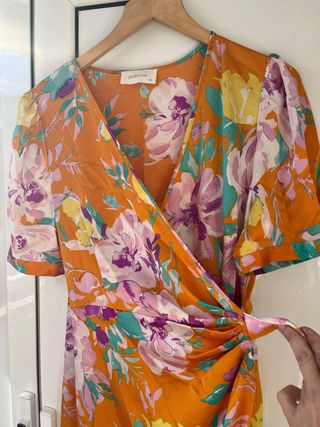 Vestido estampado floral con un diseño cruzado y drapeado. Solo una puesta para una comunion - Estampado vibrante con flores. - Diseño cruzado. - Detalle drapeado en la cintura.