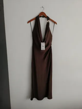 Vestido largo Zara satinado marrón Talla S