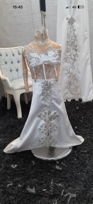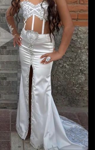 Elegante vestido largo con detalles plateados y pedrería. - Diseño con escote pronunciado y abertura en la pierna. - Adornos de pedrería en el corpiño, cintura y bajo. - Mangas largas adornadas. - Incluye un gran anillo a juego.