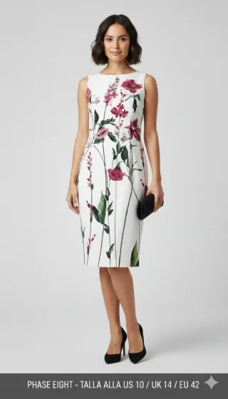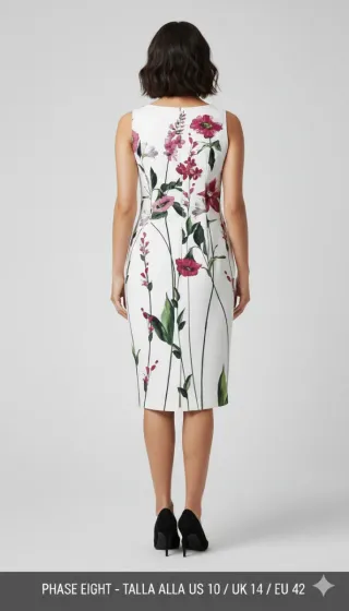 Estado: Muy buen estado / como nuevo Precioso vestido Phase Eight en color marfil/blanco roto con estampado floral en tonos rosa y verde, talla UK 14 (EU 42 / US 10). Un diseño femenino y elegante de corte midi, ideal para bodas, comuniones, bautizos, eventos de día o celebraciones especiales. ✨ Características principales: Marca: Phase Eight Talla: UK 14 (EU 42 / US 10) Color: Marfil / blanco roto Estampado floral en rosa y verde Corte midi Sin mangas Escote en pico suave Cremallera trasera Tejido fluido y elegante
