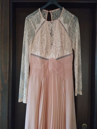 Vestido cóctel midi plisado y con cuerpo de encaje en color melocotón. Ideal para mamá de comunión o bautizo o boda de día. Es precioso y hace una silueta espectacular al tener una parte cruzada justo en la cintura. Las fotos no le hacen justicia. Talla 34-36. Marca ASOS. Está nuevo con la etiqueta.