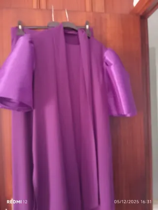 Vestido de fiesta como boda, dama de honor, comunión, bautizo,morado con un diseño asimétrico y detalles de volantes. Comprado en la tienda besito volao , con un costo de 160€. Tela preciosa, resistente, hace muy buena cintura, y es largo. - Manga larga en un lado. - Escote con volantes. - Cremallera en la espalda. -Hueco de un lado visible para la pierna