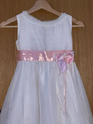 Vestido de ceremonia para niña, elegante y delicado. - perfecto para niña de hasta 10 años - Cuerpo con detalles de encaje y perforaciones. - Fajín de satén rosa con lazo. - Falda vaporosa de tul.
